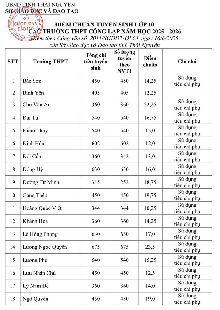 1. Điểm chuẩn vào 10 Thái Nguyên 2025