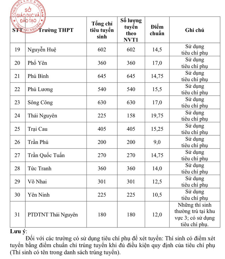Trường THPT Chu Văn An là trường đại trà có điểm chuẩn cao nhất: 37,75 điểm, tuyển 360 học sinh; tiếp đến là Trường THPT Lương Ngọc Quyến (TP. Thái Nguyên) có điểm chuẩn 37,25 điểm, tuyển 675 học sinh; Trường THPT Thái Nguyên có điểm chuẩn 33,5 điểm, tuyển 250 học sinh (nguyện vọng 1: 188 học sinh, nguyện vọng 2: 62 học sinh); Trường THPT Gang thép có điểm chuẩn 32,5 điểm, tuyển 495 học sinh; Trường THPT Ngô Quyền có điểm chuẩn 31,25 điểm, tuyển 450 học sinh; Trường THPT Trần Phú (Võ Nhai) có điểm chuẩn thấp nhất - 17 điểm), tuyển 180 học sinh (nguyện vọng 1: 162 học sinh, nguyện vọng 2: 18 học sinh), trường THPT Trần Quốc Tuấn có điểm chuẩn 22 điểm, THPT Bình Yên: 21.25 điểm, THPT Định Hóa: 18.75 điểm, THPT Bắc Sơn: 24.25 điểm.