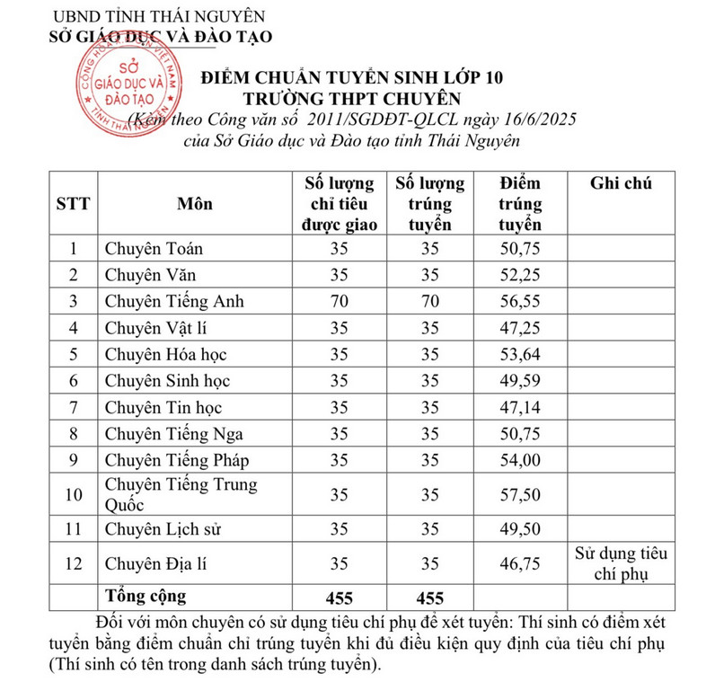 Điểm chuẩn vào lớp 10 Thái Nguyên 2025 đã được công bố đến các thí sinh ngày 16/6. Dưới đây là thông tin điểm chuẩn Thái Nguyên 2025, mời các bạn tham khảo.