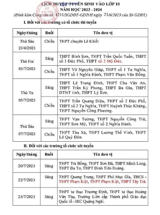 Các trường THPT Lê Trung Đình, THPT Chu Văn An, THPT Trần Kỳ Phong, THPT Ba Gia và DTNT tỉnh, THPT Trần Quang Diệu, THPT Số 2 Đức Phổ, THPT Số 2 Tư Nghĩa, THPT Huỳnh Thúc Kháng sẽ công bố điểm chuẩn vào ngày 22.6.