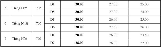 Với hệ chuyên có học bổng, điểm trúng tuyển dao động từ 28 đến 30. Ở hệ chuyên, điểm chuẩn cao nhất là 27,5 (lớp Tiếng Nhật thi theo tổ hợp D6).