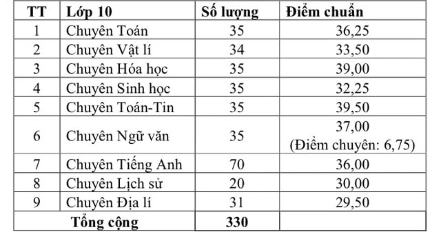 Các lớp chuyên còn lại có điểm chuẩn dự kiến lần lượt như sau: ngữ văn (37 điểm, trong đó điểm chuyên là 6,75), toán (36,25 điểm), tiếng Anh (36 điểm), vật lí (33,50 điểm), sinh học (32,25 điểm) và lịch sử (30 điểm).
