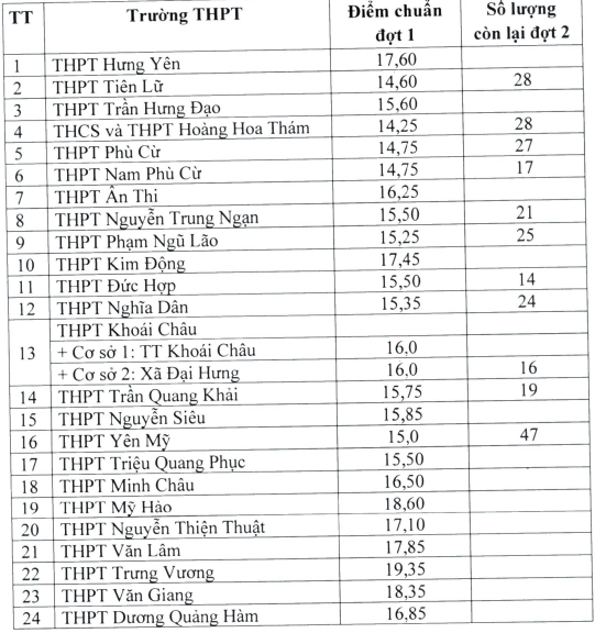 1. Sở GD&ĐT tỉnh Hưng Yên công bố điểm chuẩn trúng tuyển vào lớp 10 năm học 2024 - 2025 các trường THPT như sau: