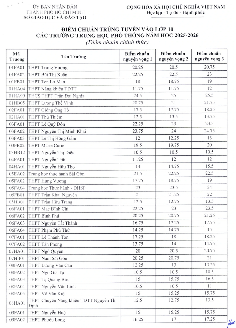 Điểm chuẩn vào lớp 10 TPHCM 2025 các trường THPT Công lập đã được công bố như sau: