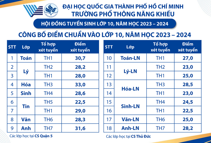 Điểm chuẩn vào lớp 10 trường phổ thông năng khiếu - ĐH Quốc gia TPHCM 2023: