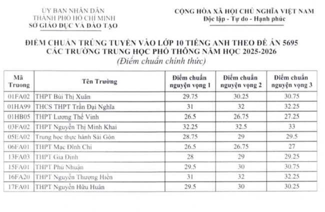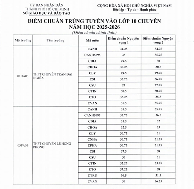 Điểm chuẩn vào lớp 10 chuyên và lớp 10 tích hợp năm học 2025-2026 ở TP.HCM như sau: