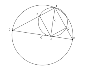 Bài 6. Cho tam giác ABC; (AB < AC) nội tiếp đường tròn (O; R) đường kính BC. Vẽ đường cao AH của tam giác ABC. Đường tròn tâm K đường kính AH cắt AB; AC lần lượt tại D và E. Biết BC = 25cm và AH = 12cm. Hãy tính diện tích xung quanh của hình tạo bởi khi cho tứ giác ADHE quay quanh AD.