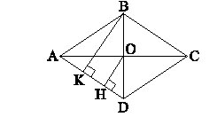 Ví dụ 1: Cho hình thoi ABCD, độ dài mỗi cạnh là 13 cm. Gọi O là giao điểm của hai đường chéo. Vẽ OH vuông góc AD. Biết OH = 6 cm, tính tỉ số của hai đường chéo BD và AC.