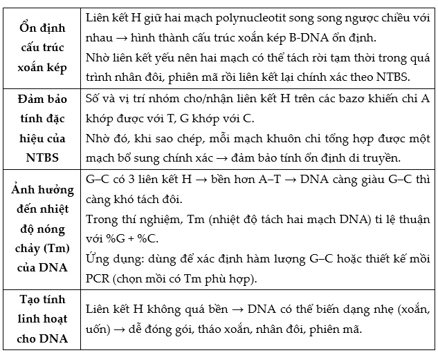 Bảng 1. Vai trò của liên kết hydrogen trong cấu trúc DNA