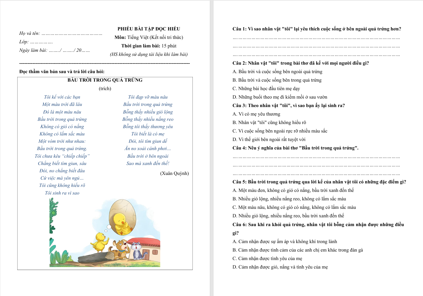 Đọc hiểu văn bản Bầu trời trong quả trứng lớp 4 Kết nối tri thức