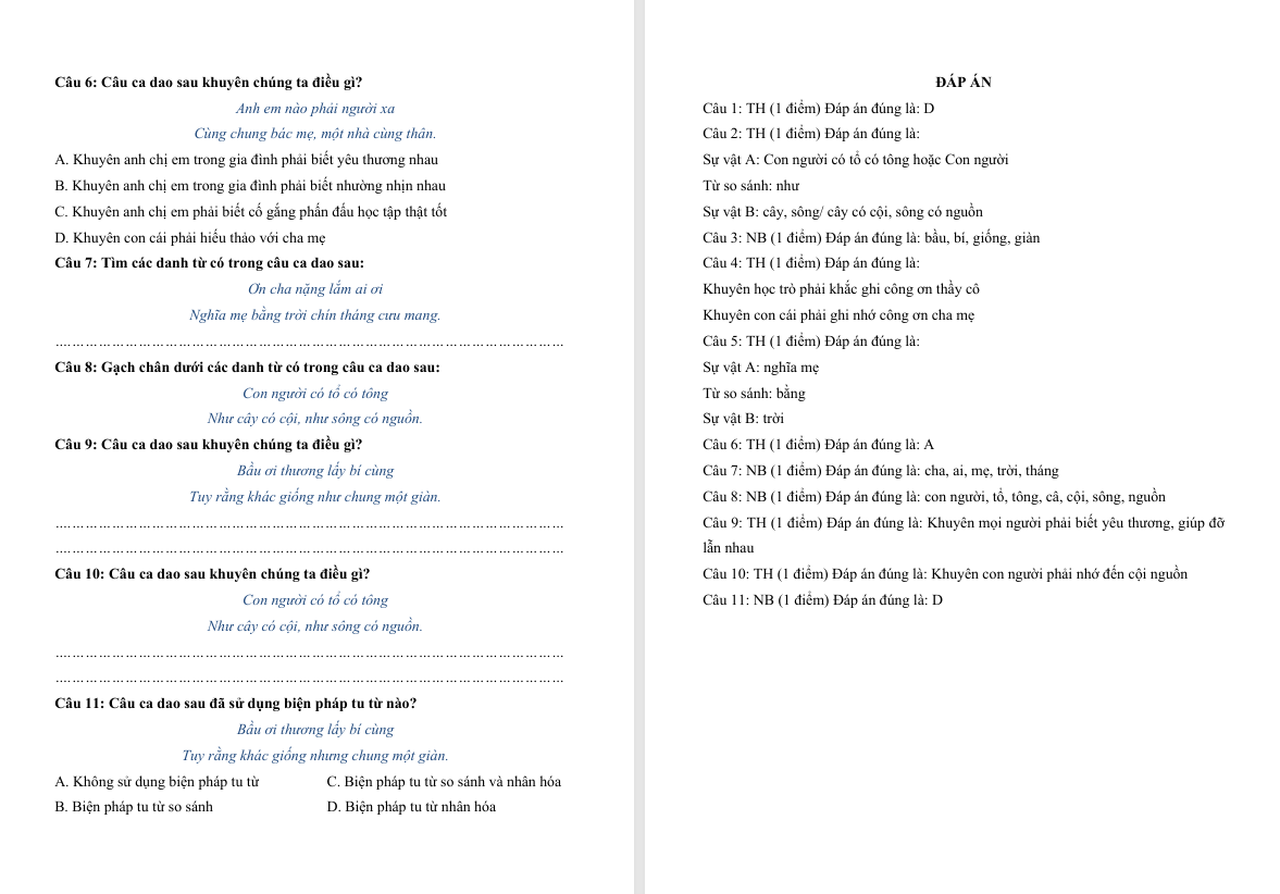 Đọc hiểu bài Ca dao về tình yêu thương lớp 4 Chân trời sáng tạo