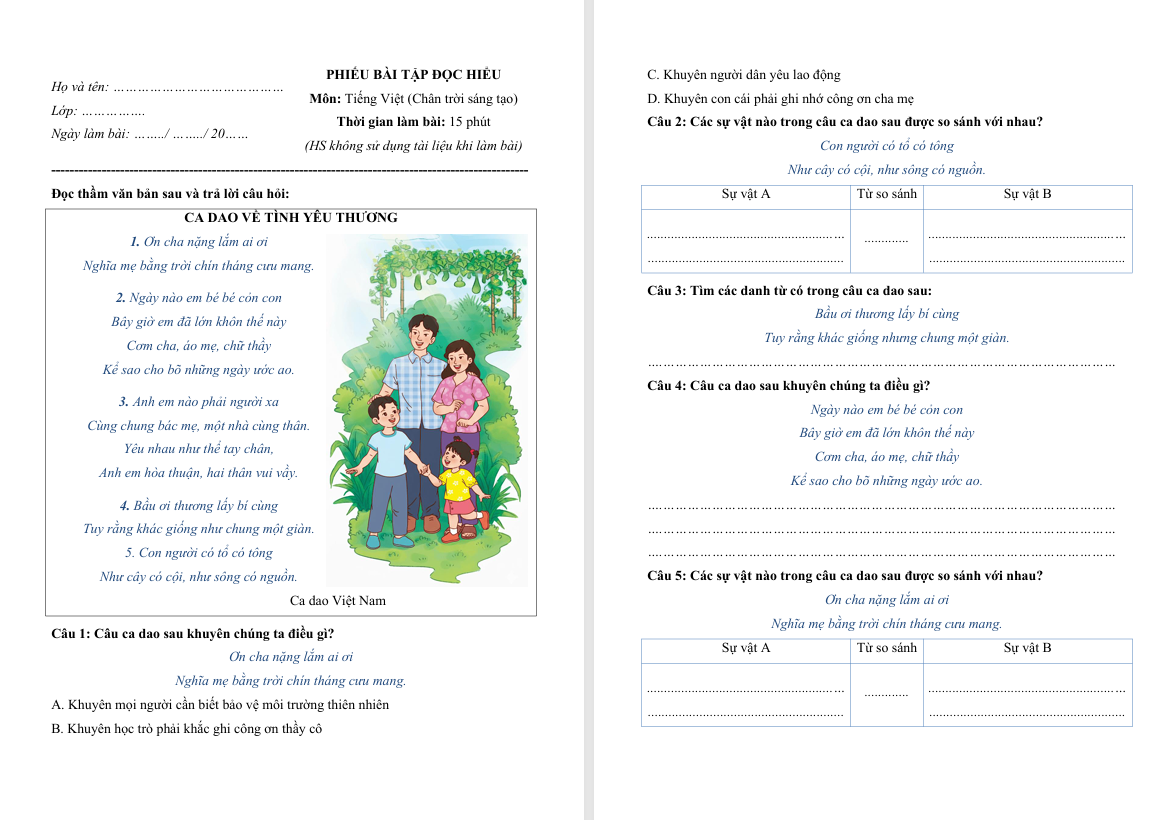 Đọc hiểu văn bản Ca dao về tình yêu thương lớp 4 Chân trời sáng tạo