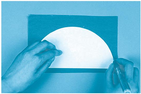 Bước thứ ba: Sau khi đã hoàn thành thao tác dán các lớp giấy chồng lên nhau, bạn đặt nửa miếng bìa tròn lên rồi dùng bút màu đánh dấu xung quanh miếng bìa. Sau đó cắt miếng giấy thành hình bán nguyệt theo đường đã vẽ.