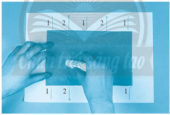 Bước thứ hai: Dùng miếng giấy màu hình chữ nhật đặt lên tờ giấy trắng, rồi đánh dấu lên tờ giấy trắng năm đường thẳng xen kẽ bởi hai loại bút khác màu. Sau đó, bạn sử dụng keo dán phết dọc theo đường màu hồng (được đánh số 2) với lớp giấy ăn đầu tiên. Đặt lớp giấy ăn thứ hai lên trên và phết keo theo đường màu xanh (được đánh số 1)