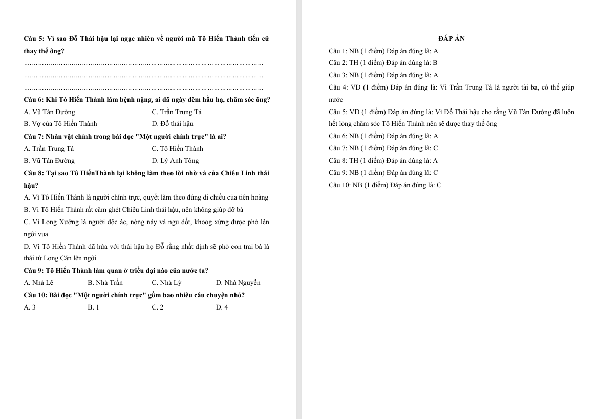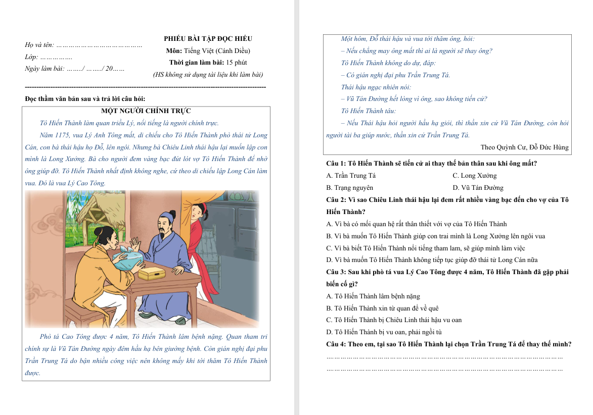 Đọc hiểu văn bản Một người chính trực lớp 4 Cánh Diều