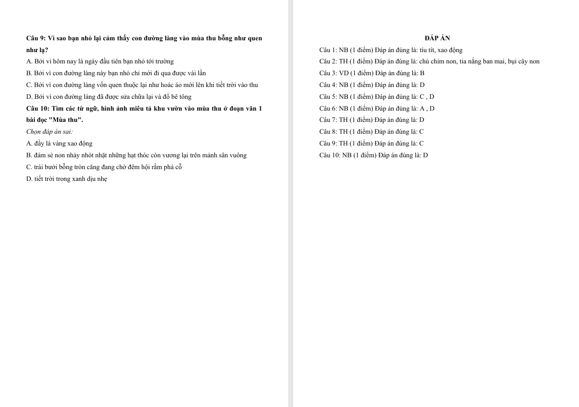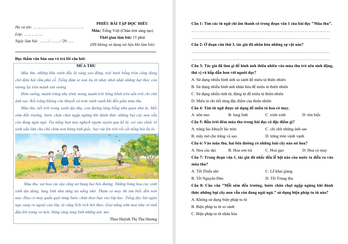 Đọc hiểu Mùa thu lớp 4