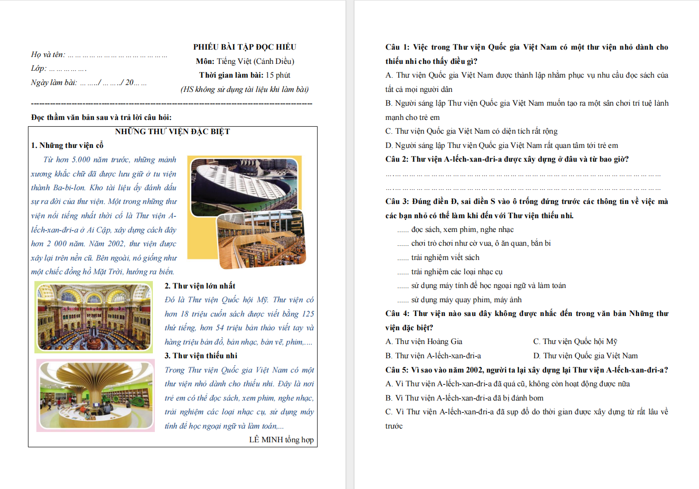 Đọc hiểu văn bản Những thư viện đặc biệt lớp 4 Cánh Diều
