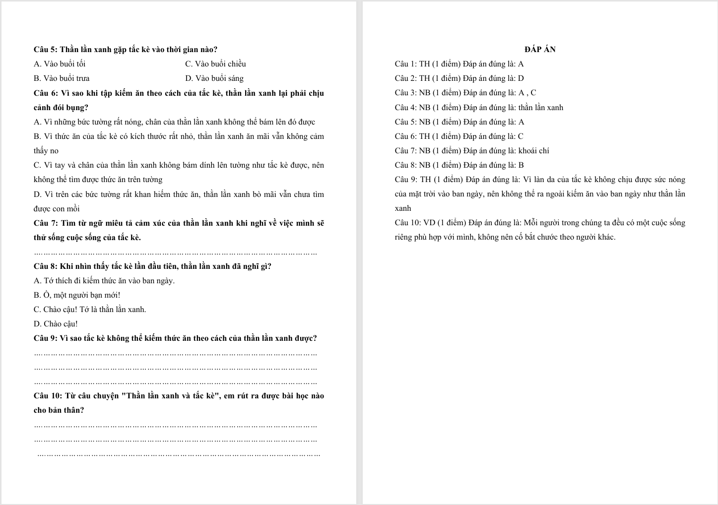 Đọc hiểu Thằn lằn xanh và tắc kè lớp 4