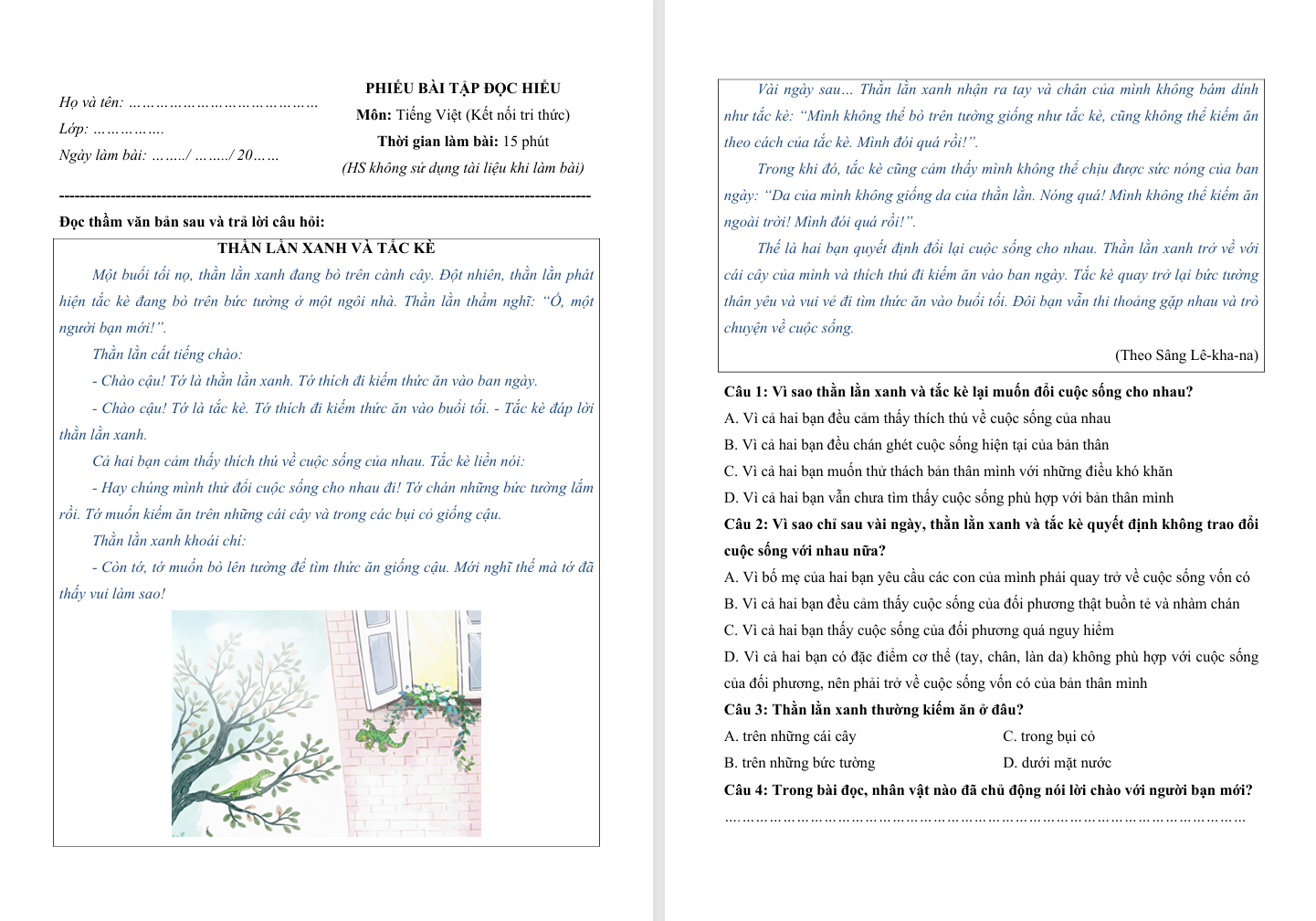 Đọc hiểu văn bản Thằn lằn xanh và tắc kè lớp 4 Kết nối tri thức