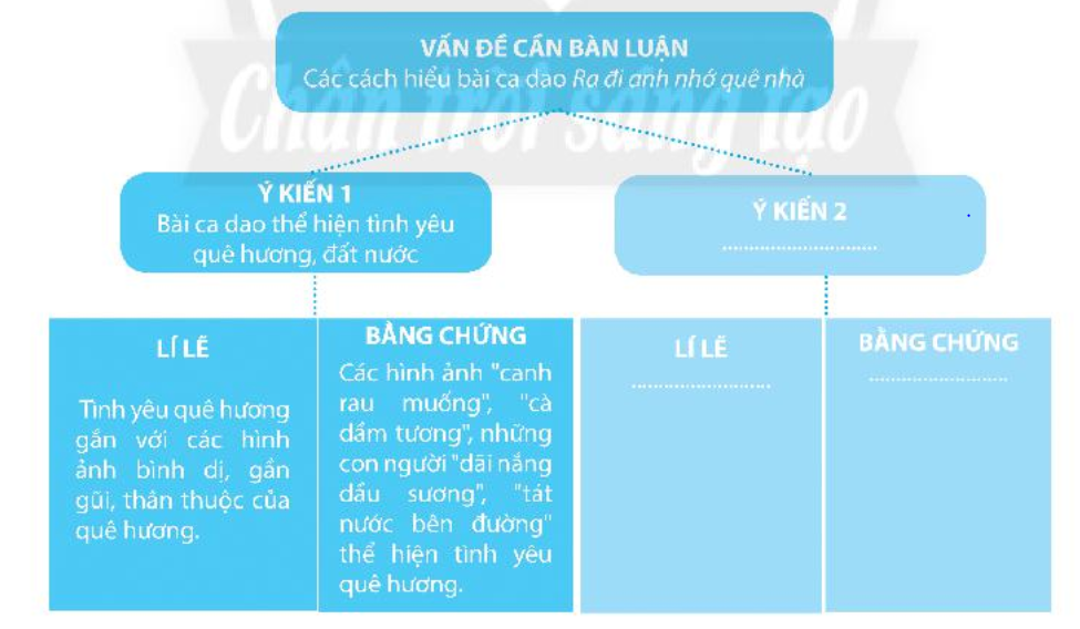 | Ý kiến 1: Bài ca dao thể hiện nỗi nhớ quê hương | Tình yêu quê hương của chàng trai gắn liền với những hình ảnh bình dị, gần gũi, thân thuộc của quê hương | Chàng trai định nghĩa quê hương qua các hình ảnh "canh rau muống", "cà dầm tương" những hình con người "dãi nắng dầm sương, tát nước bên đường" |