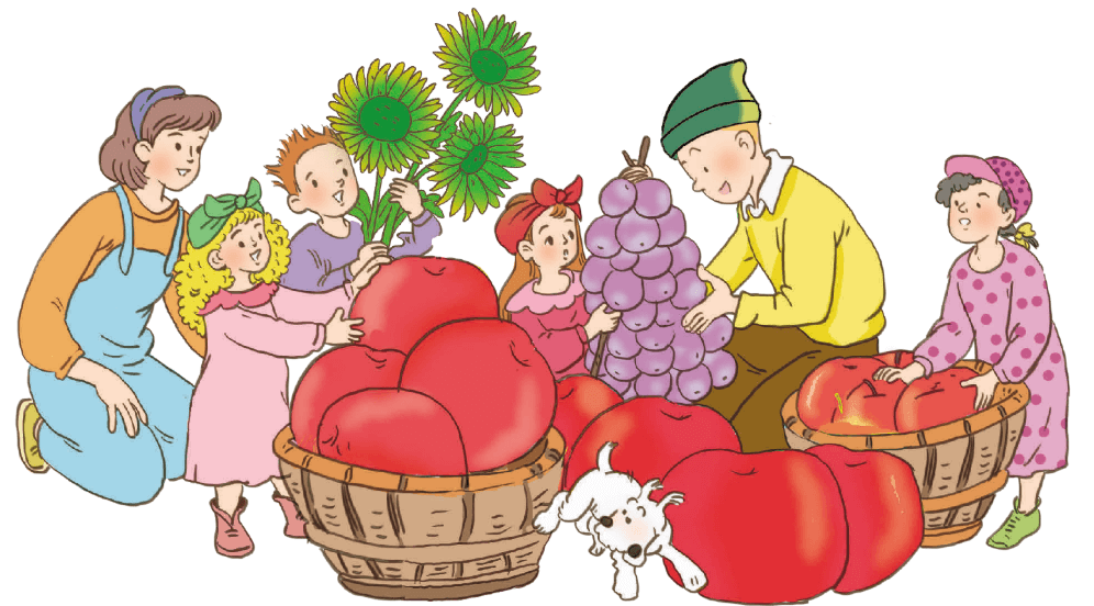 Em bé mang táo: Không! Táo đấy! Chưa phải là loại to nhất đâu! Khi mình ra đời, mình sẽ giúp mọi người trồng những loại táo to thế này.
