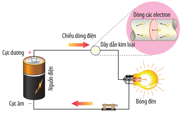 - Chiều trong dòng điện trong dây kim loại được quy ước là chiều từ cực dương của nguồn điện, qua dây dẫn và các thiết bị điện, đến cực âm của nguồn điện.