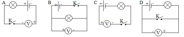 Câu 3. Vôn kế trong sơ đồ mạch điện nào dưới đây được mắc đúng?