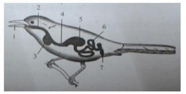 1 - miệng ; 2 - diều ; 3 - thực quản ; 4 - dạ dày cơ ; 5 - dạ dày tuyến ; 6 - ruột ; 7 - hậu môn