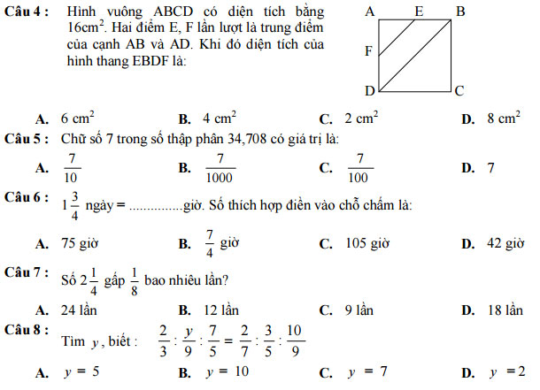 PHẦN TRẮC NGHIỆM (4 điểm) Em hãy khoanh tròn vào chữ cái đặt trước câu trả lời đúng nhất cho mỗi câu hỏi sau đây: