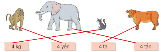 - Các số đo cân nặng đã cho được sắp xếp theo thứ tự tăng dần là: 4 kg, 4 yến, 4 tạ, 4 tấn.