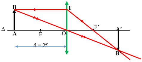 Dựng ảnh của một vật AB có độ cao h, đặt vuông góc với trục chính của thấu kính hội tụ và cách thấu kính 1 khoảng d = 2f