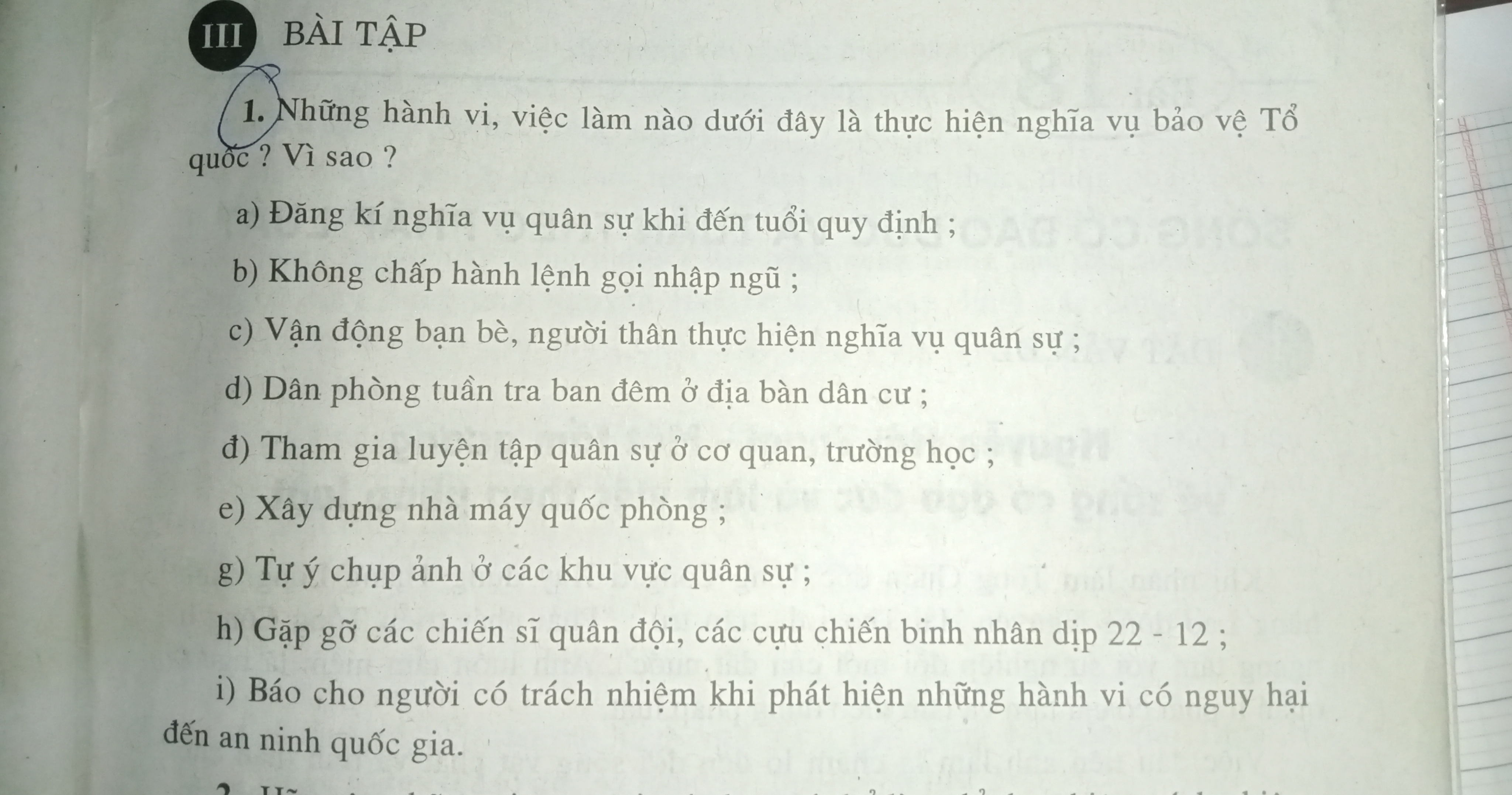 Những hành vi, việc làm nào dưới đây là thực hiện nghĩa vụ bảo vệ Tổ quốc? Vì sao?