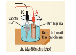 Trong môn Khoa học tự nhiên lớp 8, ta đã biết khi điện phân dung dịch muối copper(II) sulfate thì xuất hiện lớp kim loại đồng bám vào điện cực âm (K). Hiện tượng này được ứng dụng trong kĩ thuật mạ điện. Trong quá trình mạ điện, vật cần mạ được gắn với cực âm, kim loại mạ gắn với cực dương của nguồn điện trong bình điện phân. Chất điện phân thường là dung dịch muối kim loại để mạ (nếu mạ đồng, người ta dùng dung dịch CuSO4). Cực dương của nguồn điện sẽ hút các electron và giải phóng các ion kim loại dương, dưới tác dụng lực tĩnh điện các ion dương này sẽ di chuyển về cực âm, tại đây chúng nhận lại electron, hình thành lớp kim loại bám trên bề mặt của vật được mạ. .