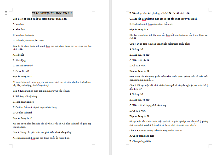 Trắc nghiệm Tin học 7 Bài 12