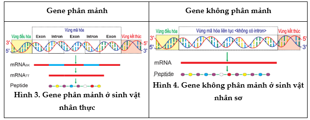 - Phần lớn gene ở SV nhân thực, vi khuẩn cổ có vùng mã hóa không liên tục: có đoạn mã hóa exon (đoạn DNA được dịch mã) và các đoạn không mã hóa intron (đoạn DNA không được dịch mã) → gene phân mảnh.