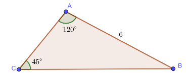 \(\hat A=120^{\circ} ,\hat C=45^{\circ} ,b=6\). Tính số đo góc