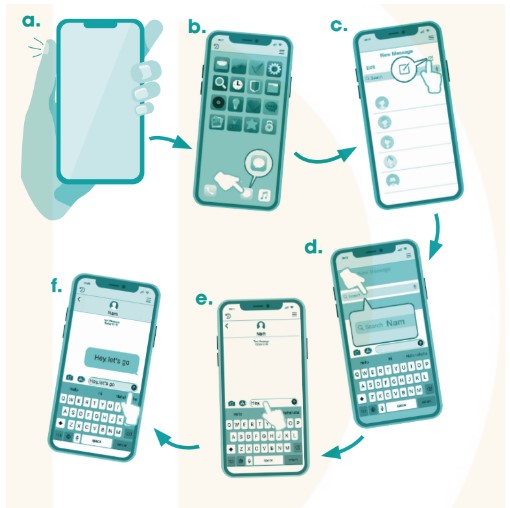1. Match the following instructions with suitable pictures. Then use First, Next, Then, After that, Finally to give complete instructions about how to send texts with a smartphone. Ghép các hướng dẫn sau với hình ảnh phù hợp. Sau đó, sử dụng Đầu tiên, Tiếp theo, Sau đó, Sau đó, Cuối cùng để cung cấp hướng dẫn đầy đủ về cách gửi tin nhắn văn bản bằng điện thoại thông minh.