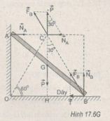 Một thanh gỗ đồng chất, khối lượng m = 3 kg được đặt dựa vào tường. Do tường và sàn đều không có ma sát nên người ta phải dùng một dây buộc đầu dưới B của thanh vào chân tường để giữ cho thanh đứng yên (H.17.6). Cho biết OA = OB