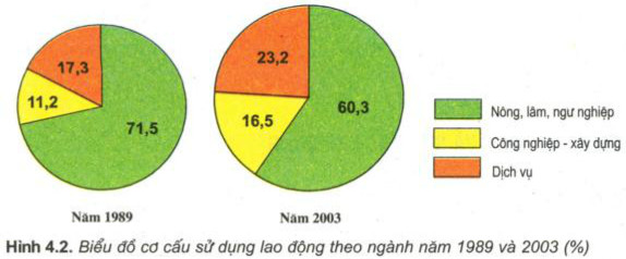 - Trong cơ cấu lao động nước ta năm 1989 và năm 2003, tỉ trọng lao động nông, lâm, ngư nghiệp đều cao, tiếp đến là tỉ trọng của lao động dịch vụ, thấp nhất là lao động công nghiệp - xây dựng.
