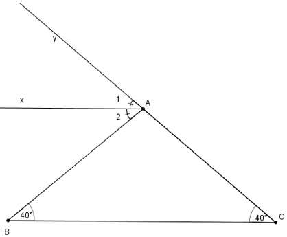 Cho tam giác ABC có góc B = góc C = 40o. Gọi Ax là tia phân giác của góc ngoài đỉnh A. Hãy chứng tó Ax // BC.