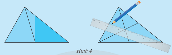 a) Cắt một tam giác bằng giấy. Gấp lại để xác định trung điểm một cạnh của nó. Kẻ đoạn thẳng nối trung điểm này với đỉnh đối diện (Hình 4). Bằng cách tương tự, hãy vẽ tiếp hai đường trung tuyến còn lại.
