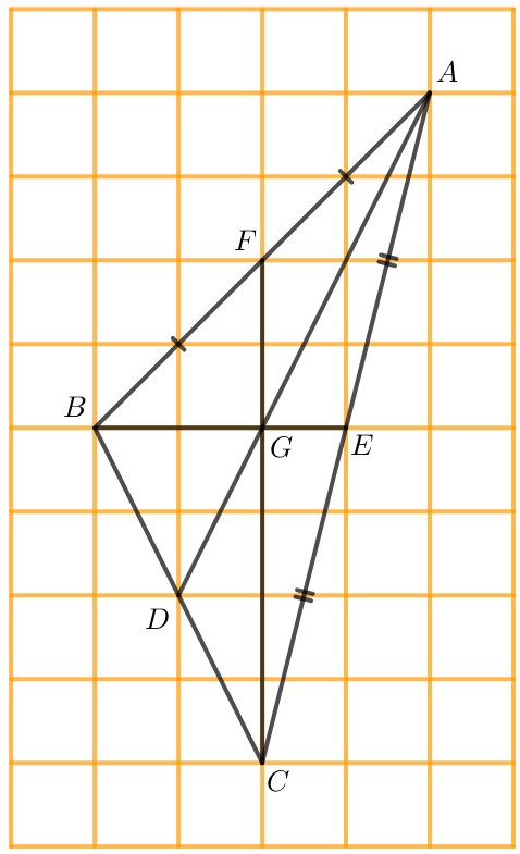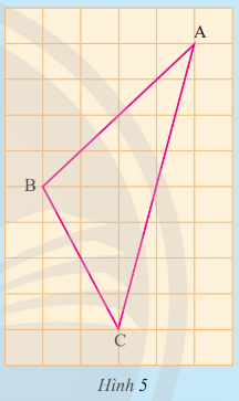 b) Em hãy đếm ô rồi vẽ lại tam giác ABC trong Hình 5 vào giấy kẻ ô vuông. Vẽ hai đường trung tuyến BE và CF của tam giác ABC. Hai đường trung tuyến này cắt nhau tại G. Tia AG cắt BC tại D.