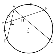 Cho đường tròn (O) và hai dây AB, AC. Gọi M, N lần lượt là điểm chính giữa của cung AB và cung AC. Đường thẳng MN cắt dây AB tại E và cắt dây AC tại H. Chứng minh tam giác AEH là tam giác cân.