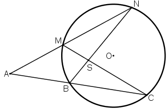 Qua điểm A nằm bên ngoài đường tròn (O) vẽ hai cát tuyến ABC và AMN sao cho hai đường thẳng BN và CM cắt nhau tại một điểm S nằm bên tròn đường tròn.