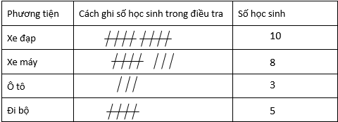 Kết quả thống kê phương tiện đi đến trường của học sinh lớp 5B