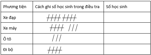 a) Em hãy điền vào cột 3 (số học sinh) tương ứng với kết quả điều tra về phương tiện giao thông đến trường của các em học sinh lớp 5B