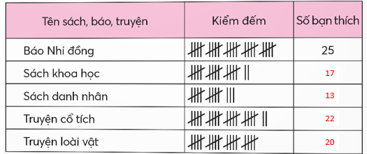 Đếm số bạn thích mỗi loại sách, báo, truyện rồi điền số thích hợp vào bảng.