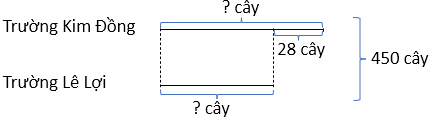 Trong lễ hội trồng cây, Trường Tiểu học Lê Lợi và Trường Tiểu học Kim Đồng trồng được tất cả 450 cây. Trường Tiểu học Lê Lợi trồng được ít hơn Trường Tiểu học Kim Đồng là 28 cây. Hỏi mỗi trường trồng được bao nhiêu cây?