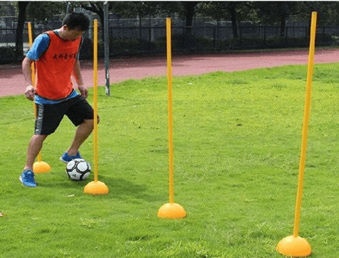 Dẫn bóng bằng mu trong dàn chân theo đường dích dắc, luồn cọc từ chậm đến nhanh và luân phiên đổi chân khi vòng sang phải, sang trái. Thực hiện 2 – 3 lần