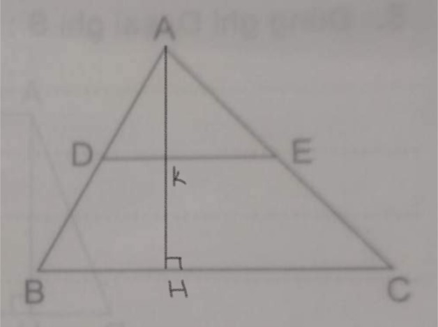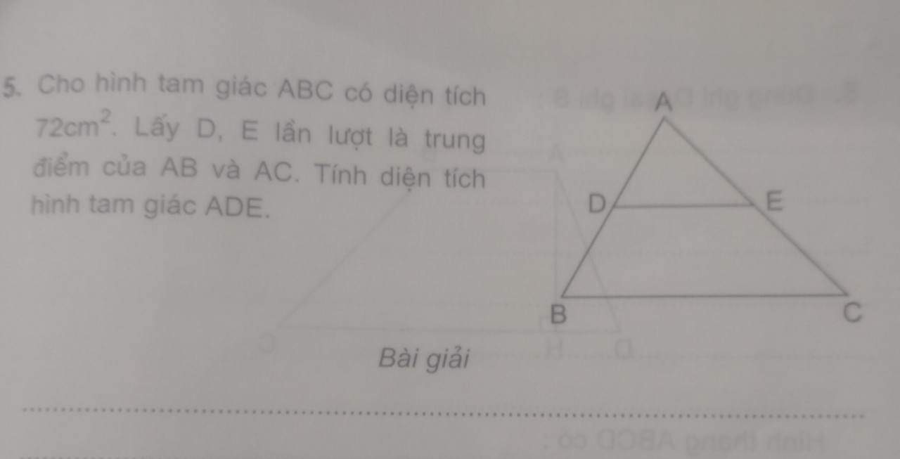 Cho hình tam giác ABC có diện tích . lấy D,E lần lượt là trung điểm của AB và AC. Tính diện tích hình tam giác ADE.